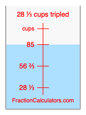Here we will calculate 28 1/3 cups tripled and illustrate 28 1/3 cups tripled on a measuring cup. What is 28 1/3 cups tripled? 28 1/3 cups tripled is 28 1/3 cups times three. Therefore, to triple 28 1/3 cups, we multiply 28 1/3 by 3. Here is the formula, the math, and the answer to 28 1/3 cups tripled: