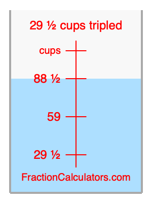 Here we will calculate 29 1/2 cups tripled and illustrate 29 1/2 cups tripled on a measuring cup. What is 29 1/2 cups tripled? 29 1/2 cups tripled is 29 1/2 cups times three. Therefore, to triple 29 1/2 cups, we multiply 29 1/2 by 3. Here is the formula, the math, and the answer to 29 1/2 cups tripled: