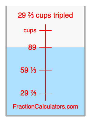 Here we will calculate 29 2/3 cups tripled and illustrate 29 2/3 cups tripled on a measuring cup. What is 29 2/3 cups tripled? 29 2/3 cups tripled is 29 2/3 cups times three. Therefore, to triple 29 2/3 cups, we multiply 29 2/3 by 3. Here is the formula, the math, and the answer to 29 2/3 cups tripled: