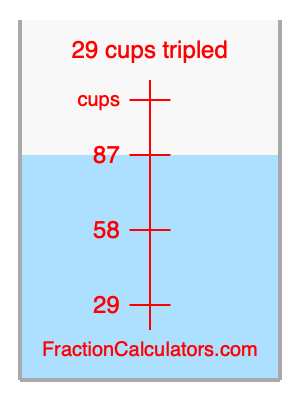 Here we will calculate 29 cups tripled and illustrate 29 cups tripled on a measuring cup. What is 29 cups tripled? 29 cups tripled is 29 cups times three. Therefore, to triple 29 cups, we multiply 29 by 3. Here is the formula, the math, and the answer to 29 cups tripled: