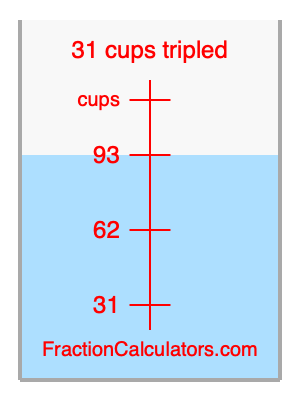 Here we will calculate 31 cups tripled and illustrate 31 cups tripled on a measuring cup. What is 31 cups tripled? 31 cups tripled is 31 cups times three. Therefore, to triple 31 cups, we multiply 31 by 3. Here is the formula, the math, and the answer to 31 cups tripled: