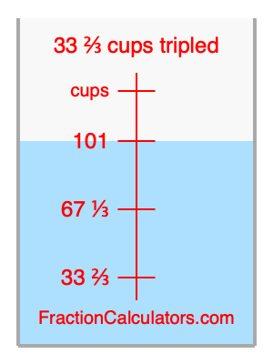 Here we will calculate 33 2/3 cups tripled and illustrate 33 2/3 cups tripled on a measuring cup. What is 33 2/3 cups tripled? 33 2/3 cups tripled is 33 2/3 cups times three. Therefore, to triple 33 2/3 cups, we multiply 33 2/3 by 3. Here is the formula, the math, and the answer to 33 2/3 cups tripled: