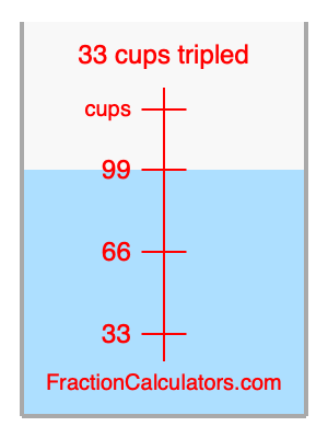 Here we will calculate 33 cups tripled and illustrate 33 cups tripled on a measuring cup. What is 33 cups tripled? 33 cups tripled is 33 cups times three. Therefore, to triple 33 cups, we multiply 33 by 3. Here is the formula, the math, and the answer to 33 cups tripled: