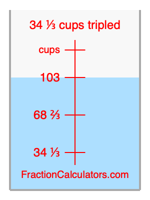 Here we will calculate 34 1/3 cups tripled and illustrate 34 1/3 cups tripled on a measuring cup. What is 34 1/3 cups tripled? 34 1/3 cups tripled is 34 1/3 cups times three. Therefore, to triple 34 1/3 cups, we multiply 34 1/3 by 3. Here is the formula, the math, and the answer to 34 1/3 cups tripled: