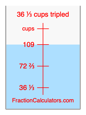 Here we will calculate 36 1/3 cups tripled and illustrate 36 1/3 cups tripled on a measuring cup. What is 36 1/3 cups tripled? 36 1/3 cups tripled is 36 1/3 cups times three. Therefore, to triple 36 1/3 cups, we multiply 36 1/3 by 3. Here is the formula, the math, and the answer to 36 1/3 cups tripled: