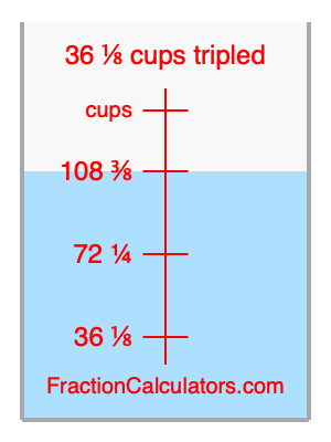 Here we will calculate 36 1/8 cups tripled and illustrate 36 1/8 cups tripled on a measuring cup. What is 36 1/8 cups tripled? 36 1/8 cups tripled is 36 1/8 cups times three. Therefore, to triple 36 1/8 cups, we multiply 36 1/8 by 3. Here is the formula, the math, and the answer to 36 1/8 cups tripled: