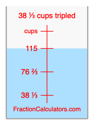 Here we will calculate 38 1/3 cups tripled and illustrate 38 1/3 cups tripled on a measuring cup. What is 38 1/3 cups tripled? 38 1/3 cups tripled is 38 1/3 cups times three. Therefore, to triple 38 1/3 cups, we multiply 38 1/3 by 3. Here is the formula, the math, and the answer to 38 1/3 cups tripled: