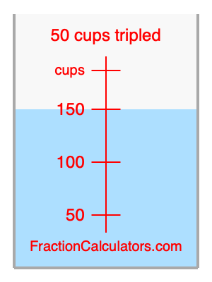 Here we will calculate 50 cups tripled and illustrate 50 cups tripled on a measuring cup. What is 50 cups tripled? 50 cups tripled is 50 cups times three. Therefore, to triple 50 cups, we multiply 50 by 3. Here is the formula, the math, and the answer to 50 cups tripled: