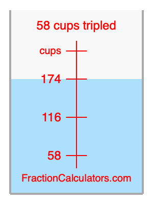 Here we will calculate 58 cups tripled and illustrate 58 cups tripled on a measuring cup. What is 58 cups tripled? 58 cups tripled is 58 cups times three. Therefore, to triple 58 cups, we multiply 58 by 3. Here is the formula, the math, and the answer to 58 cups tripled:
