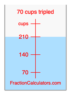Here we will calculate 70 cups tripled and illustrate 70 cups tripled on a measuring cup. What is 70 cups tripled? 70 cups tripled is 70 cups times three. Therefore, to triple 70 cups, we multiply 70 by 3. Here is the formula, the math, and the answer to 70 cups tripled: