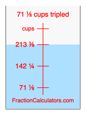 Here we will calculate 71 1/8 cups tripled and illustrate 71 1/8 cups tripled on a measuring cup. What is 71 1/8 cups tripled? 71 1/8 cups tripled is 71 1/8 cups times three. Therefore, to triple 71 1/8 cups, we multiply 71 1/8 by 3. Here is the formula, the math, and the answer to 71 1/8 cups tripled: