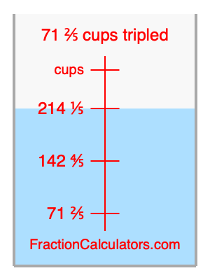 Here we will calculate 71 2/5 cups tripled and illustrate 71 2/5 cups tripled on a measuring cup. What is 71 2/5 cups tripled? 71 2/5 cups tripled is 71 2/5 cups times three. Therefore, to triple 71 2/5 cups, we multiply 71 2/5 by 3. Here is the formula, the math, and the answer to 71 2/5 cups tripled: