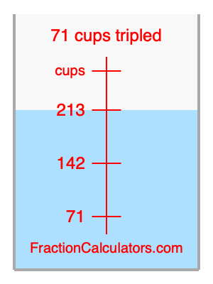 Here we will calculate 71 cups tripled and illustrate 71 cups tripled on a measuring cup. What is 71 cups tripled? 71 cups tripled is 71 cups times three. Therefore, to triple 71 cups, we multiply 71 by 3. Here is the formula, the math, and the answer to 71 cups tripled: