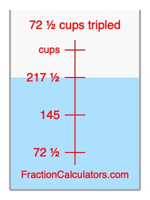Here we will calculate 72 1/2 cups tripled and illustrate 72 1/2 cups tripled on a measuring cup. What is 72 1/2 cups tripled? 72 1/2 cups tripled is 72 1/2 cups times three. Therefore, to triple 72 1/2 cups, we multiply 72 1/2 by 3. Here is the formula, the math, and the answer to 72 1/2 cups tripled: